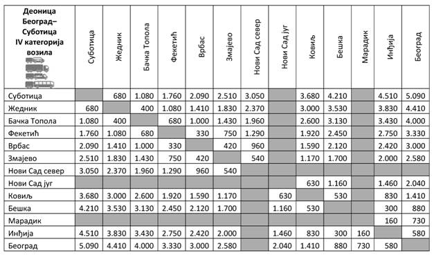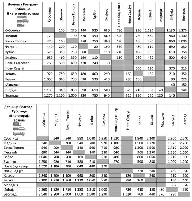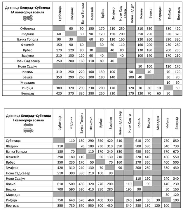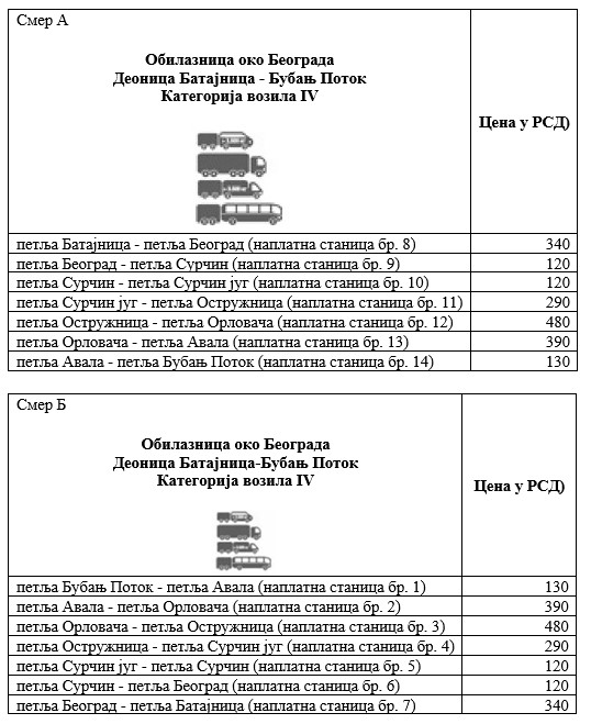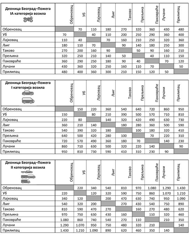 Iznose visine posebne naknade za upotrebu javnog puta, njegovog dela i putnog objekta (putarina) u zavisnosti od kategorije vozila i karakteristične deonice auto-puta za deonicu Beograd - Preševo - Dimitrovgrad sa ukrštanjem sa Moravskim koridorom za IA, I, II, III i IV kategoriju vozila, možete pogledati OVDE