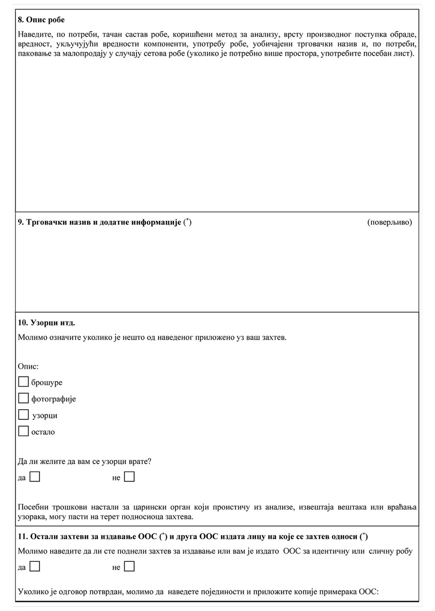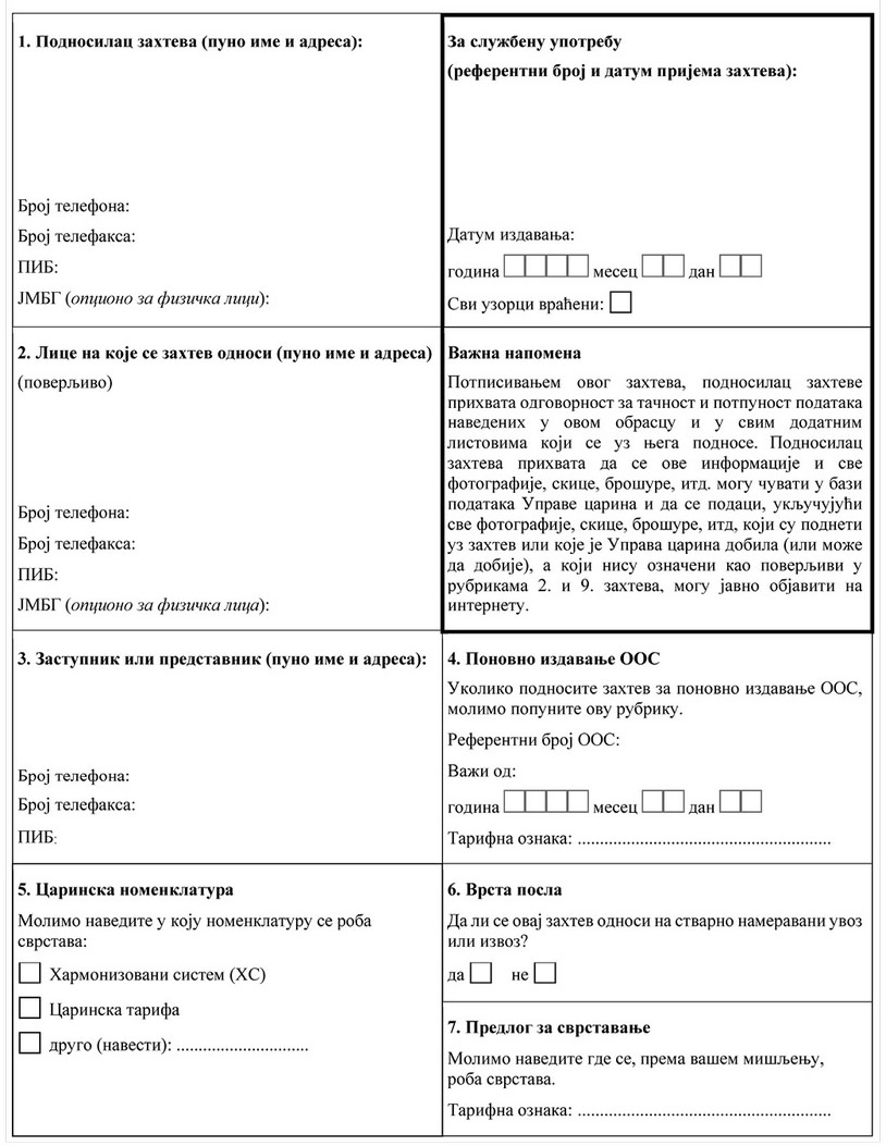 ZAHTEV ZA IZDAVANJE OBAVEZUJUĆEG OBAVEŠTENJA O SVRSTAVANJU ROBE (OOS)
